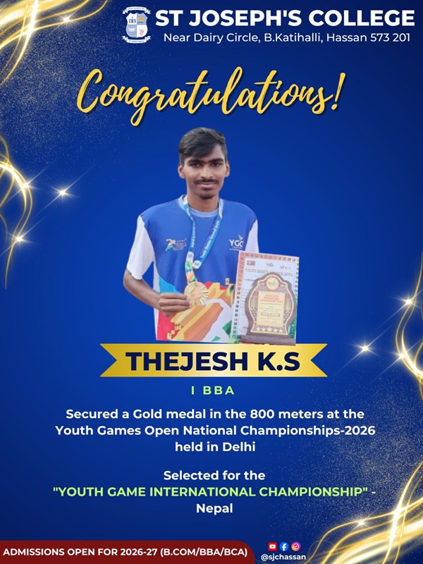 St Joseph’s College, Hassan, proudly congratulates Thejesh K.S (I BBA) on his remarkable
