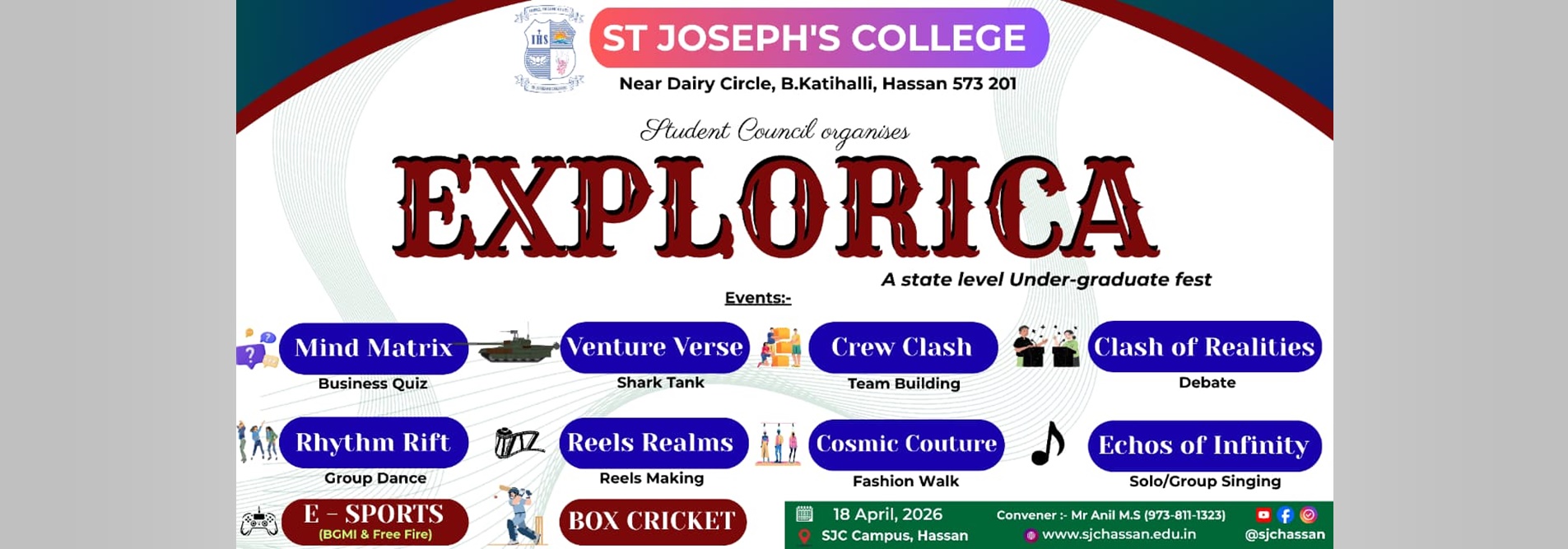 St. Joseph’s College, Hassan, proudly announces EXPLORICA 2026 – The Multiverse Odyssey, a State-Level Undergraduate Fest organized by the Student Council. The fest is scheduled to be held on 18th April 2026 at the college campus near Dairy Circle, B. Katihalli, Hassan .